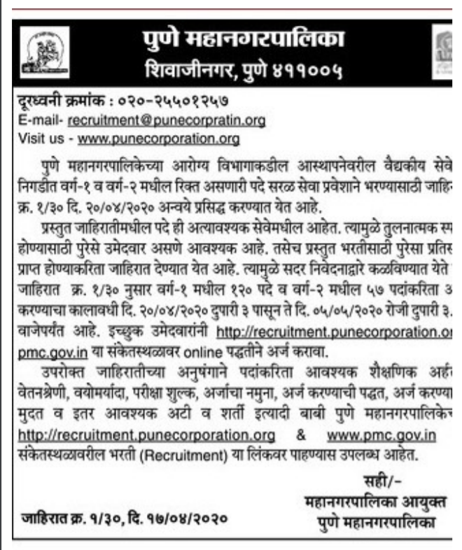 Pune Mahanagarpalika Recruitment 2020 Apply Online Pune Recruitment 2020 Eligible candidates are directed to submit their application online through www.arogya.maharashtra.gov.in this Website. Total various Vacant Posts have been announced by Recruitment Board, PMC Bharti 2020 in the advertisement in April 2020.